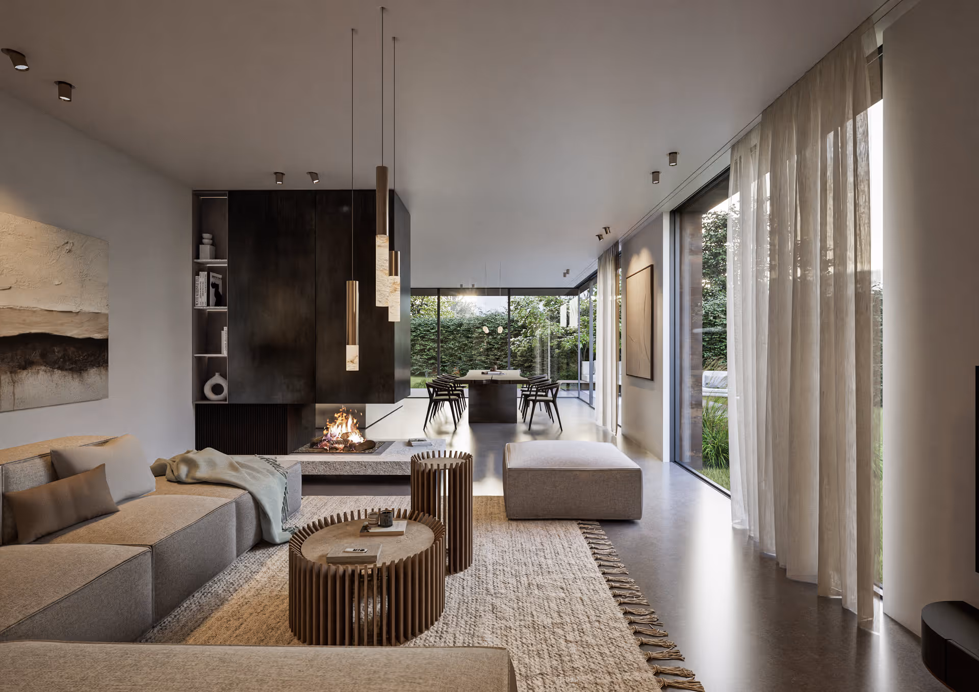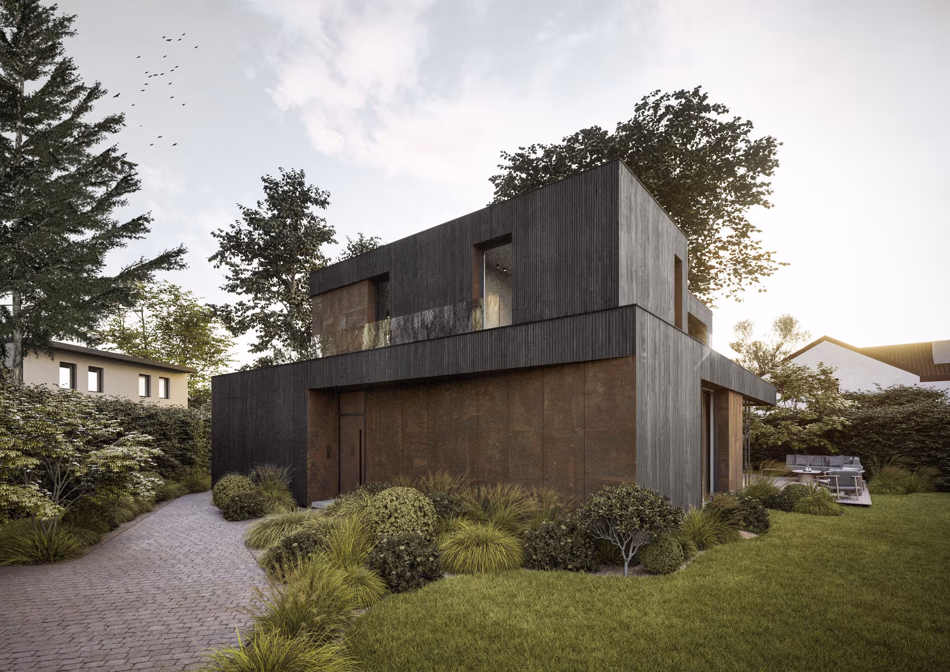 Das Haus zeigt sich minimalistisch, modern und zugleich funktional, mit klaren Volumen und großzügigen Raumproportionen. Die äußere Gestalt lebt vom Dialog zweier roher und beständiger Materialien: verkohltes Holz und Cortenstahl. Diese Kombination verleiht der Villa eine authentische, charakterstarke Ausstrahlung und hebt sie subtil von der umliegenden Wohnbebauung ab.