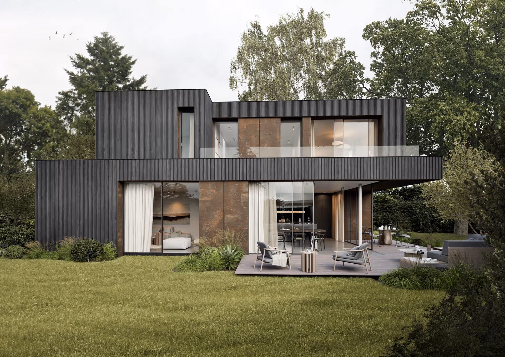 Eine Kombination aus karbonisiertem Holz und Cortenstahl prägt die moderne, minimalistische Villa in Hamburg-Othmarschen. Durch gezielte Rücksprünge und Einschnitte erhält die strenge rechteckige Kubatur eine lebendige Tiefe und eine unverwechselbare Identität.